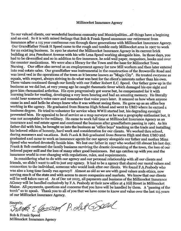 Houlton, Maine – The F. A. Peabody Company (FAPCO) announces the acquisition of the Millinocket Insurance Agency (MIA) of Millinocket, Maine. MIA roots date back to 1910 when Frank H. Speed and his wife, Lena, started selling fire insurance policies in addition to also selling wallpaper, magazines, books and pharmaceuticals out of a small brick office which still exists today on 204 Penobscot Avenue in Millinocket. The location was also used by the Speeds as the town library, a nurse’s office, an employment agency to help the Great Northern find mill workers, and finally, a real estate brokerage. The agency perpetuated under the hard-working guidance of Speed’s son, Robert, and most recently with Robert’s sons today: Bob and Frank Speed. With no family perpetuation apparent, Bob and Frank looked for another locally owned family-run firm to continue the tradition upon their retirement. Bob Speed states; “We were looking for an agency with good values and ethics stiving to maintain a local connection to the clients and the community. We feel the F. A. Peabody Company meets the criteria.”